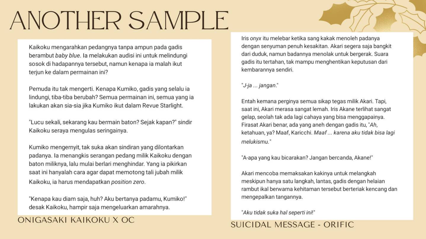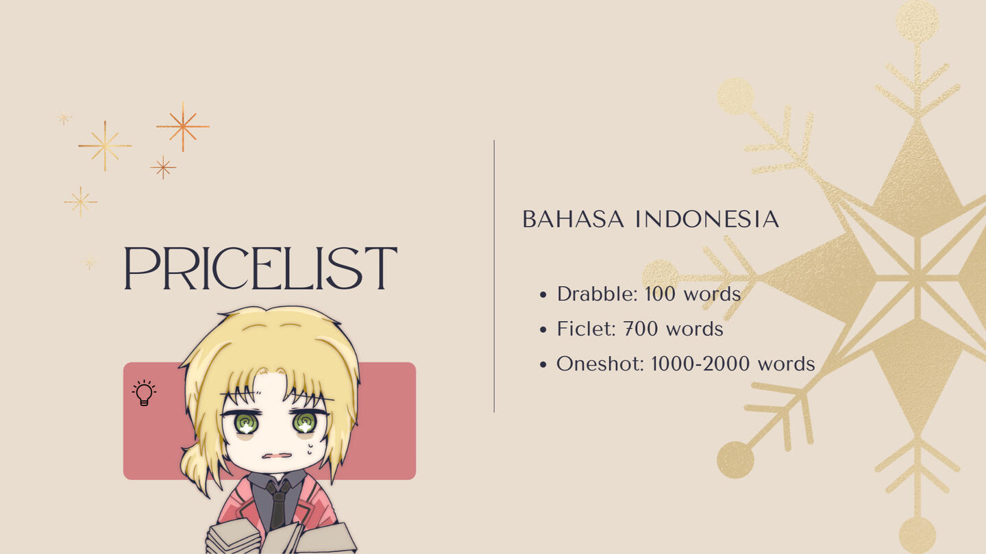 - Oneshot, 1000-2500 wordsPilihan di atas hanya sebagai patokan, biaya tetap dikenakan sesuai dengan ketentuan per kata (Minimal pembelian 300 words)
