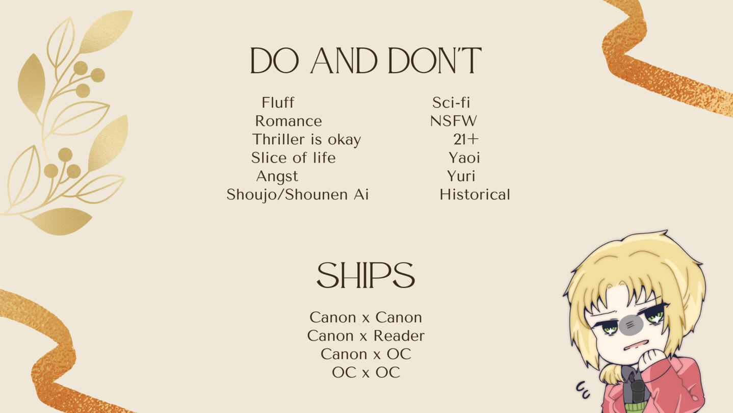 - Tidak menerima NSFW kecuali thriller. Untuk ciuman dan sebatas gigit masih diperbolehkan.