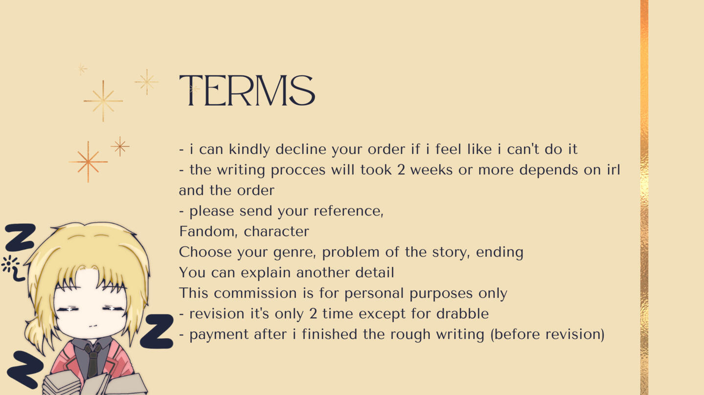 - Oneshot, 1000-2500 wordsPilihan di atas hanya sebagai patokan, biaya tetap dikenakan sesuai dengan ketentuan per kata (Minimal pembelian 300 words)